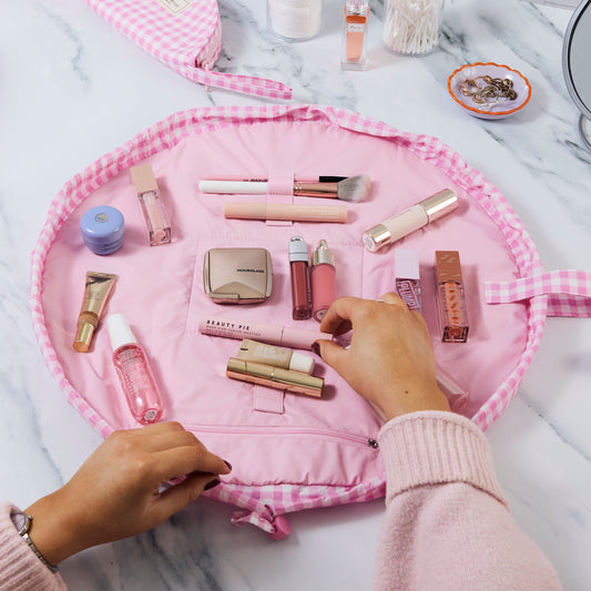 Parachute Drawstring Flat Lay Makeup Bag - Pink Gingham