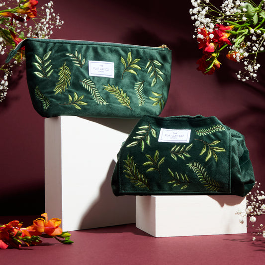 Drawstring Flat Lay Makeup Bag - Green Leaves Embroidered Velvet