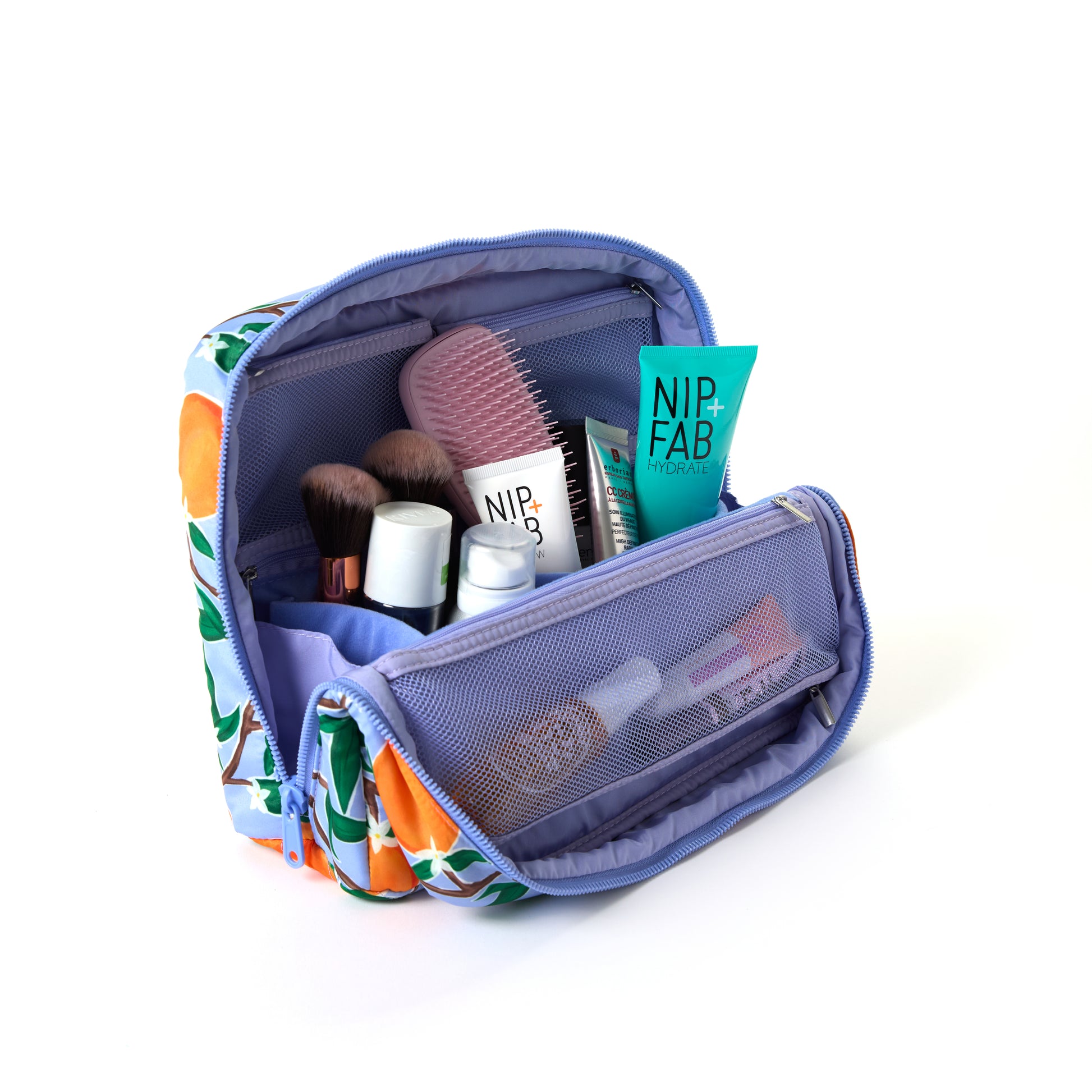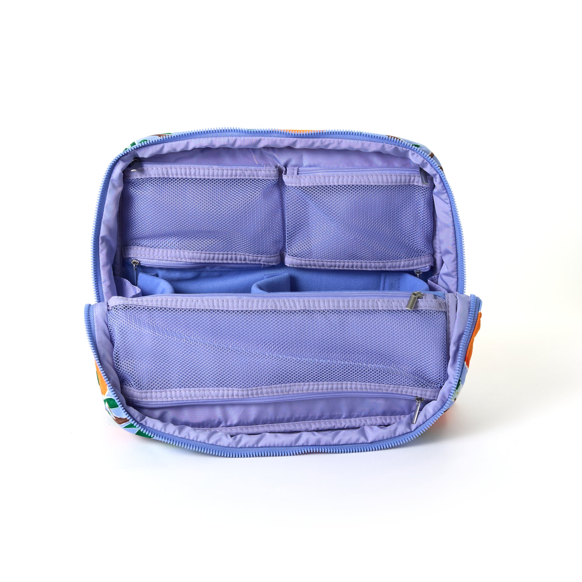 Moveable dividers fit your routine (not the other way around), while mesh pockets keep smaller essentials neatly contained. When you’re finished, zip it closed to protect your products and instantly clear your counter.